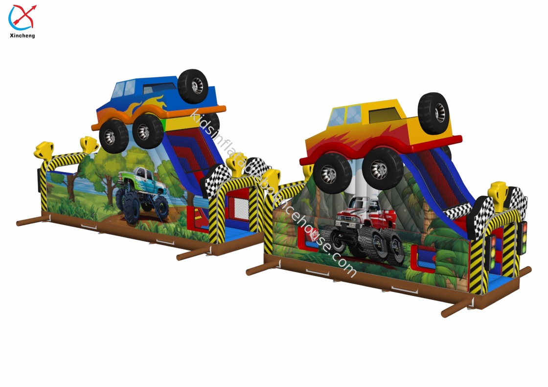 Parcours d'obstacles gonflable pour course de voitures dans une usine avec toboggan