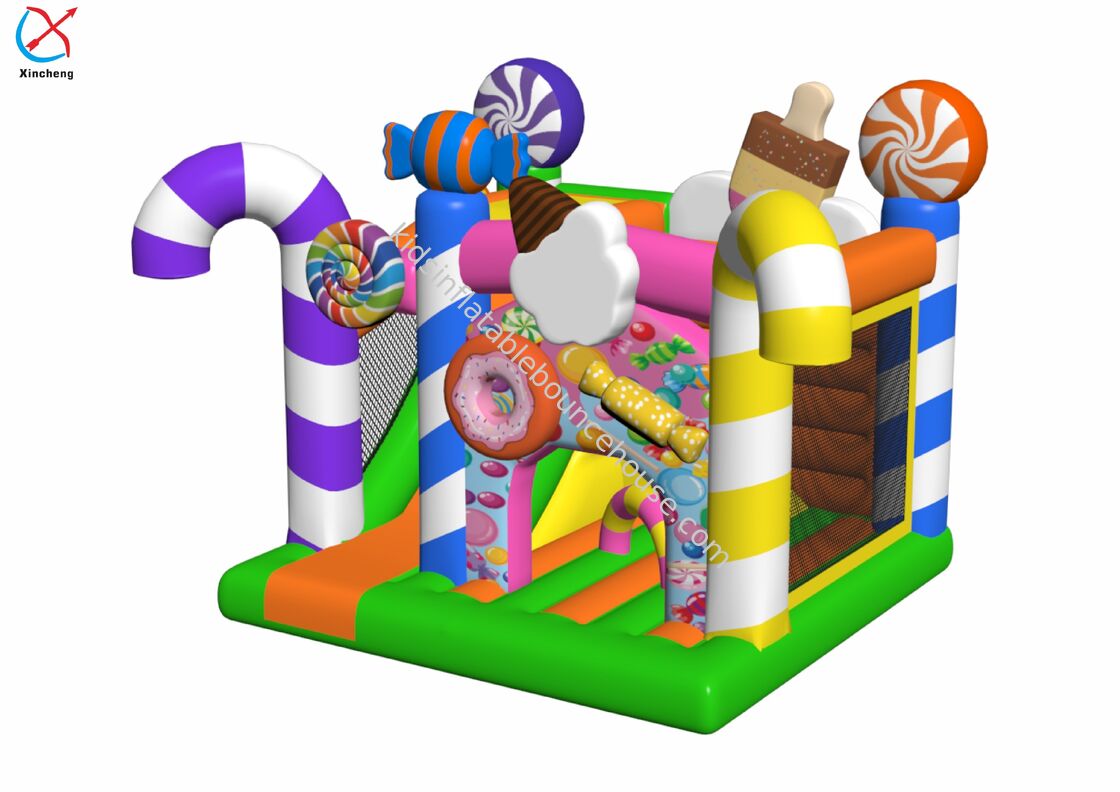Château gonflable de qualité commerciale avec un thème de bonbons dynamique, avec une diapositive intégrée pour une valeur de jeu et un divertissement améliorés.